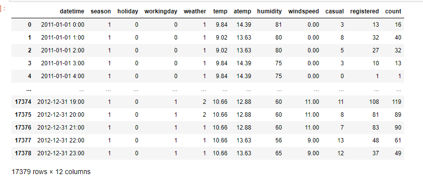 데이터에 관한 설명을 간단하게 하자면, 일단 X의 값을 가지고 자전거 수요량을 예측하기 위해서 만든 데이터 값이다.