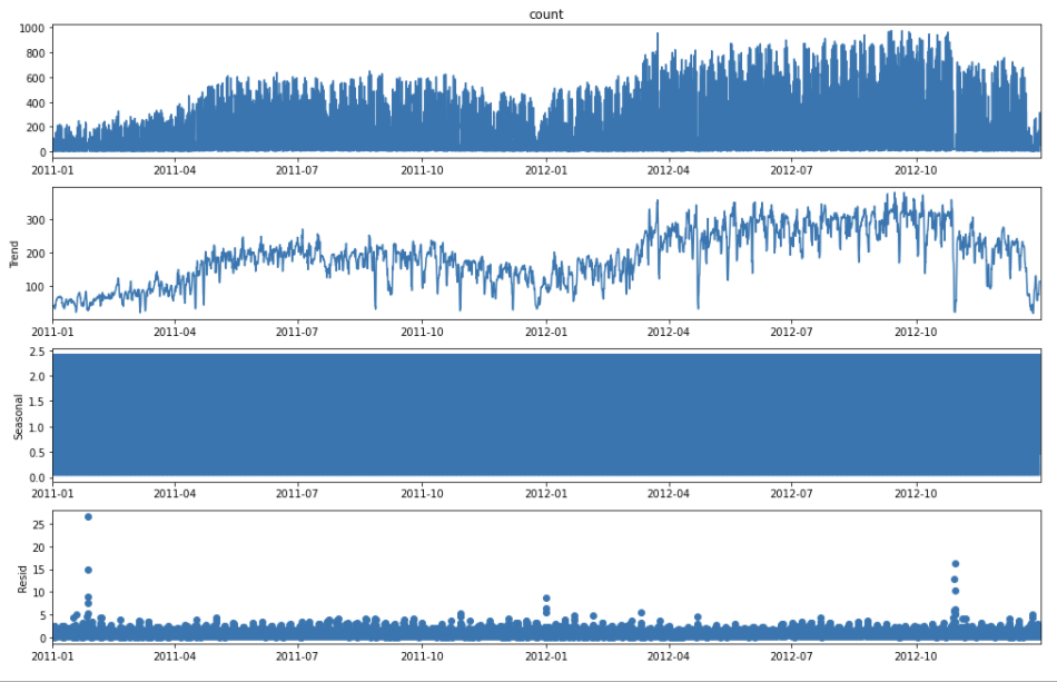 위에서부터 기존의 count 데이터, Trend, Seasonal, Residual을 나타내는 그래프이다.