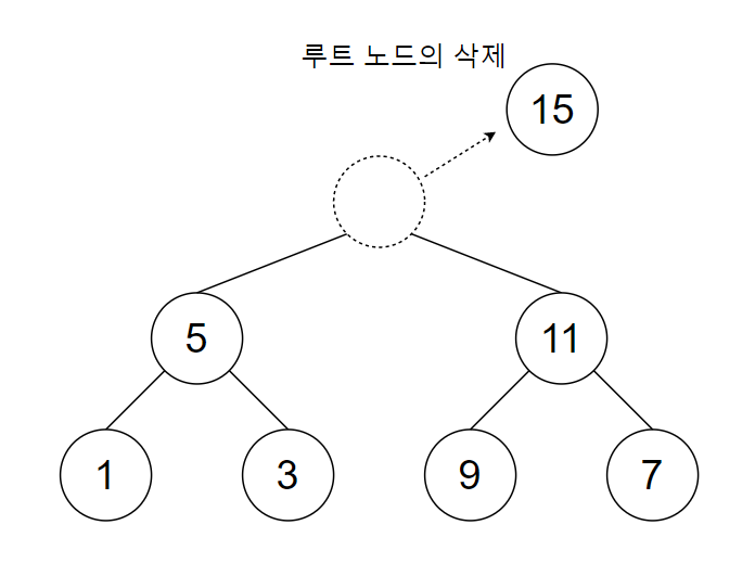 그림과 같이 최대 힙에서 최댓 값을 가지는 루트 노드(15)를 제거한다.