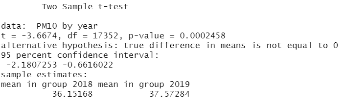 t.test(data = data, PM10 ~ year, var.equal = T)