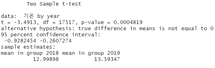 비교 대상을 기온으로 바꿔서 t test를 시행한 결과다. 미세먼지와 마찬가지로, 두 집단의 기온의 평균도 2019년이 높다고 해석할 수 있다. 이러한 방식으로 R을 사용해서 두 집단의 평균을 비교할 수 있다.