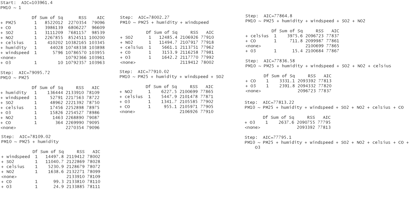 모든 변수를 포함한 모델에서 시작했지만, 제거된 변수 없이 전진선택과 같은 결과가 나타났다.