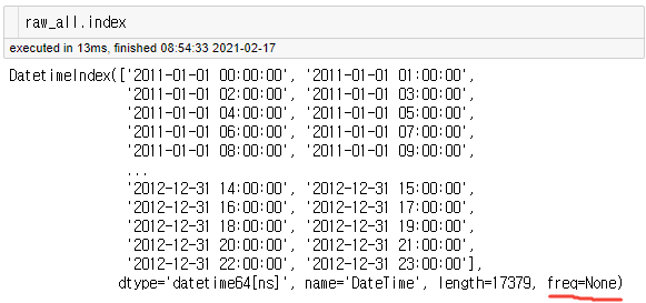 빨간색 밑줄이 쳐져있는 부분이 Frequency를 나타내고 있는 부분이다. 아직까지 빈도에 대해서는 설정해준 것이 없기 때문에 None으로 되어있는 것을 확인할 수 있다. 이를 설정해주기 위해서는 pd.asfreq( ) 를 통해서 설정할 수 있다. 이렇게 빈도를 설정하게 되면, 데이터에 있는 시간 범위 내에 해당 시각이 없는 경우, 자동으로 NaN으로 채워진 새로운 행이 채워진다.
