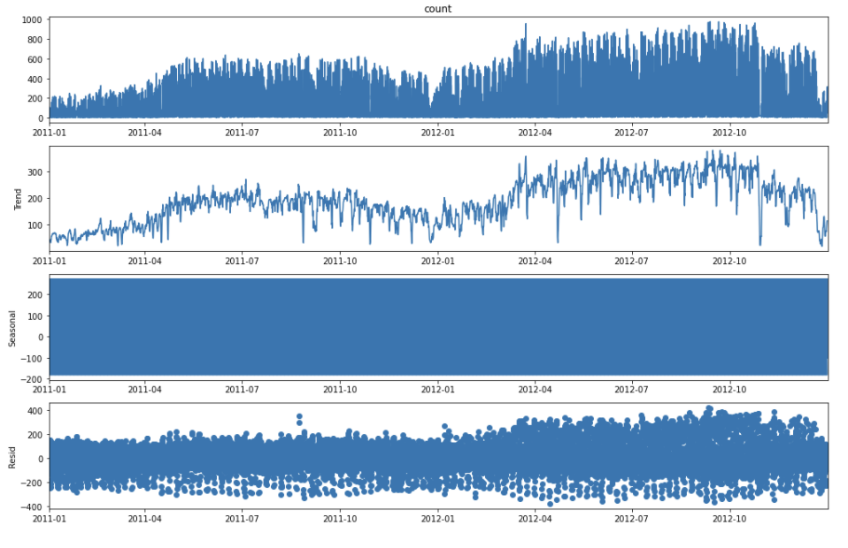 seasonal_decompose( ) 후 세가지 특성 각각에 접근할 수도 있다. 위의 코드와 같이 시계열 요소 추출을 저장해놓은 변수 뒤에 .trend, .seasonal, .resid를 통해서 각각의 값에 접근이 가능하고, 실제로 여기에서는 trend와 seasonal을 'count_trend'와 'count_seasonal'이라는 새로운 열을 만들어 원본 DataFrame에 추가하였다.