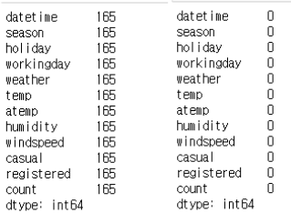 첫번째 줄은 이렇게 새롭게 생긴 행의 개수를 각 열마다 확인하기 위한 코드이고, 두번째 줄은 이렇게 생성된 행을 앞 혹은 뒤의 데이터를 이용해서 자동으로 채워지도록 하기 위해서 method 파라미터에 'bfill', 'ffill'을 입력한 것이다.