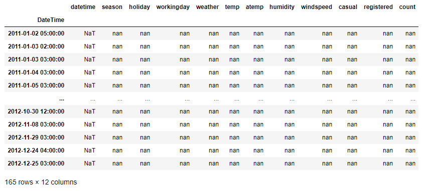 빈도를 시간('H')으로 설정했을 때, 비어있던 행(새롭게 생성한 행)만을 추출해서 DataFrame으로 만든 결과이다. 확인해보면, 2011-01-02 5시, 2011-01-03 2시 등의 기존의 DataFrame에서는 없던 행이었고, NaN값들로 채워져 새롭게 생성된 것을 볼 수 있다.