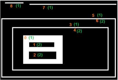 아래 그림을 통해서 보면 5번과 6번 contour는 박스에 구멍이 뚫린 상자의 바깥쪽 line과 안쪽 line을 가리킨다. 이 때 계층 구조는 바깥쪽 line - 안쪽 line으로 명확하게 된다. 다만, 그 안쪽에 있는 3번과 4번 contour는 6번보다 안쪽에 있음에도 불구하고 contour 계층관계를 다시 정립한다. 마찬가지로 바깥쪽 line - 안쪽 line의 계층 관계를 가지므로 5번과 3번 contour는 같은 계층에 속하게 된다.