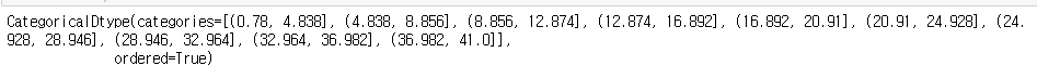 pd.cut( )은 연속된 숫자형에서 처음과 끝의 범위를 기준으로 사용자가 지정하는 카테고리의 개수만큼을 동일한 간격으로 나누어 카테고리화를 진행한다.