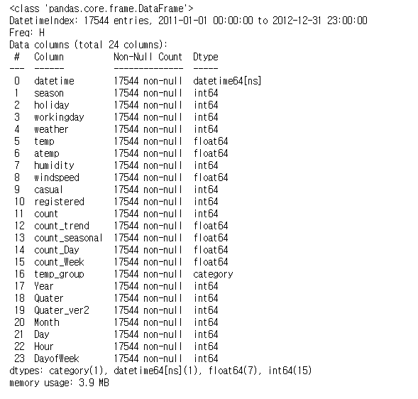 11번 열인 'count' 이후로 23번 열까지는 데이터 전처리 과정에서 새롭게 생성된 열이라는 것을 확인할 수 있고, temp_group은 category형 데이터 타입, 그 외에는 숫자형 데이터 타입을 가지고 있다는 것을 확인할 수 있다.