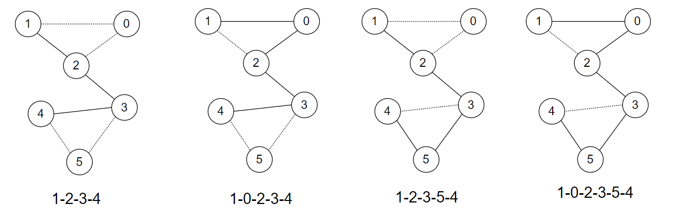 다음 그림을 통해 자세히 살펴보자. 아래 그림은 노드 1에서 노드 4까지 가는 경로 4가지 경우를 나타낸 것이다.