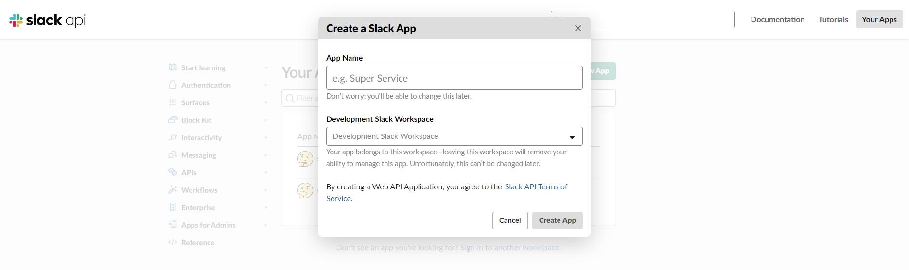 그러면 해당 창이 뜨는데, App Name에는 말 그대로 사용할 API의 이름을, Development Slack Workspace에는 해당 어플리케이션을 설치할 워크스페이스를 선택한다.
