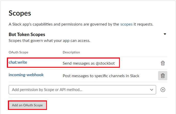 Add an OAuth Scope를 클릭해 api가 워크스페이스에 채팅을 쓸 수 있는 권한을 부여한 후, 맨 위로 올라가 OAuth Tokens & Redirect URLs에서 Install to Workspace 버튼을 클릭하면, 전에 설정한 워크스페이스에 해당 api가 설치된다. 그러면 OAuth Token이 발행되는데, 이 토큰을 이용하면 워크스페이스에 접근하여 채팅할 수 있는 권한을 얻게 된다. 일종의 방문증이라고 생각하면 된다. (이 토큰은 보안이 유지되어야 한다.)