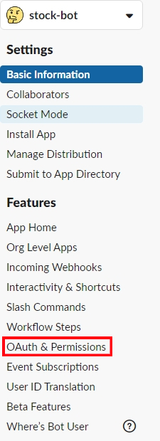 생성을 완료했으면 좌측 메뉴바에서 OAuth & Permission 메뉴를 선택해준다. OAuth란, 기존의 아이디와 비밀번호로 인증하던 전통적인 방식을 개방형으로 표준화한 것으로 이 인증을 공유하는 어플리케이션끼리는 별도의 인증이 필요 없게 하여 여러 어플리케이션을 통합하여 사용하는 것이 가능하도록 만든 것이다. 소셜로그인도 OAuth를 이용한 기능 중 하나이다.