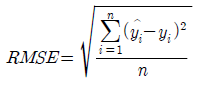 - RMSE : MSE(Mean Square Error)의 제곱근에 해당하는 값으로, 해당 연구에서는 MAPE가 갖는 선형적 특성을 보완하는 보조 지표 용도로 사용했다.