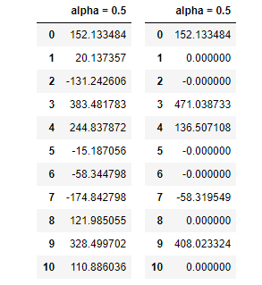 각각 Ridge와 Lasso를 사용해서 정규화를 실행하고, 결과로 나오는 DataFrame을 확인한다.