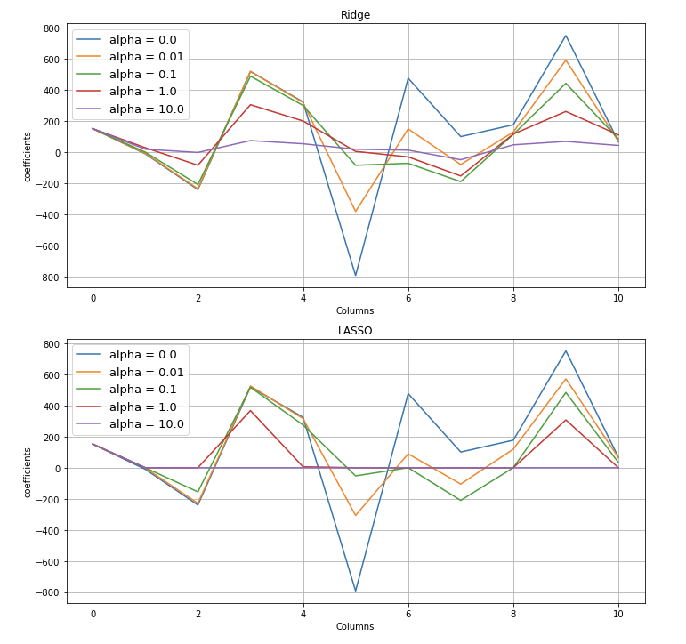 이번에는 각 Ridge와 Lasso의 lambda(코드에서는 alpha)의 계수를 변화시켜가며, 계수들이 어떤 방향으로 변화하는지에 대해서 살펴보자.