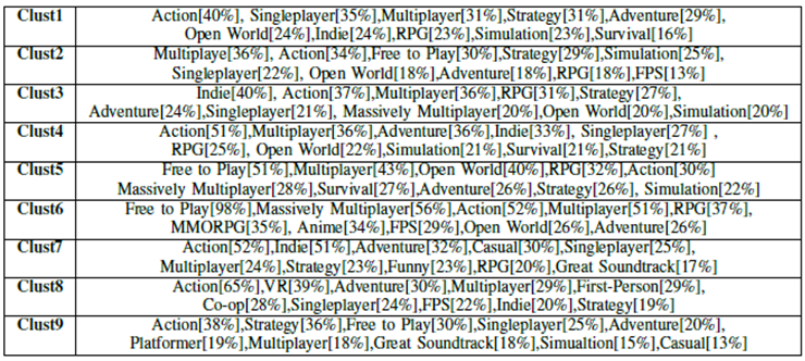 - 태그: 태그는 게임 특성을 나타내는 데 사용되며, 가중치를 적용해 나타난 클러스터 별 게임 태그 비율 파악