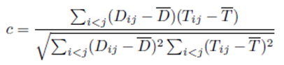 Tij : i와 j 데이터 object 사이의 덴드로그램에서 Cophenetic 거리(데이터 object가 덴드로그램에 처음 결합되는 링크의 높이)