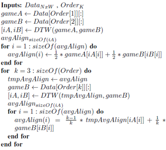 각 클러스터가 나타내는 패턴을 시각화하려면 클러스터 별 주간 플레이어 모집단 패턴을 구성해야 한다. 이를 위해 DTW 기반 평균화 절차를 수행했으며, 알고리즘은 다음과 같다.