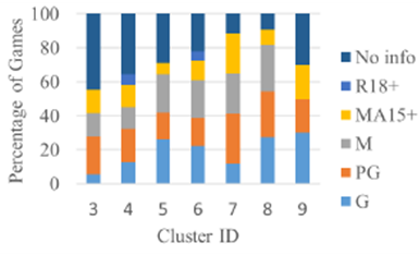 - 연령 제한: 게임 등급 기준은 'Australian Classification Board’에 따라 클러스터 별 연령층 파악