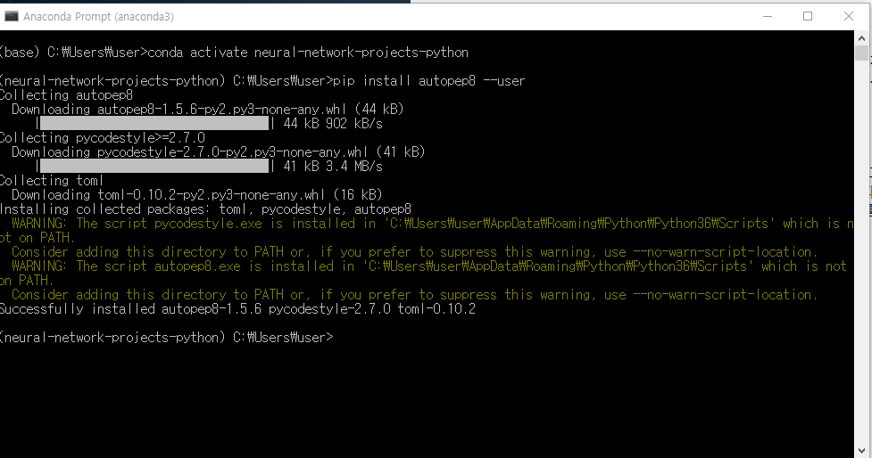 나의 경우도, 다시 아나콘다 프롬프트를 재시작하여, 해당하는 가상환경을 활성화 시킨 후에 코드를 입력하여 autopep8을 설치했다. 그 후, 다시 파이선 파일을 동일한 디렉토리에서 생성한 결과 정상적으로 파일이 만들어지는 것을 확인할 수 있었다.