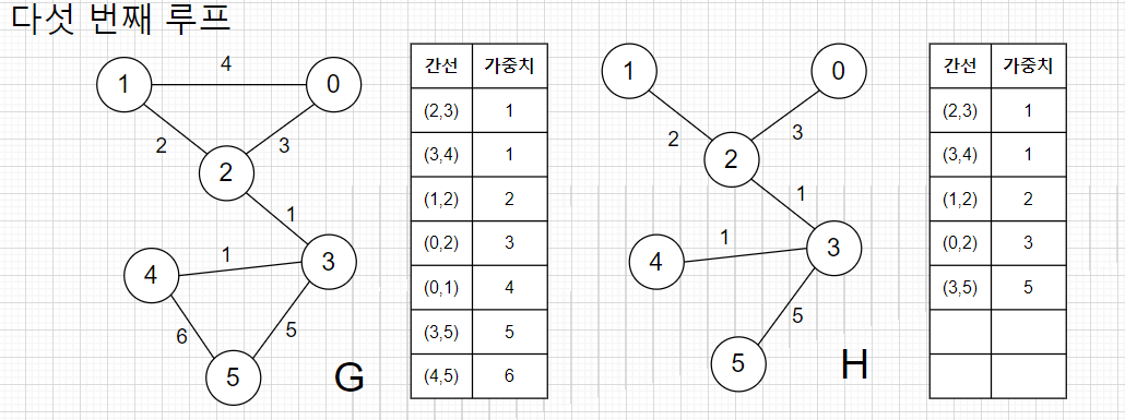 Step-1 : 남은 간선들중에서 가중치가 작은 (0,1)을 추출한다. (0,1)은 신장 트리 H에서 순환 구조를 만들기 때문에 H에 추가하면 안된다. 따라서 (0,1)은 버리고 그다음 작은 (3,5)를 추출한다. (3,5)는 신장 트리 H에서 순환구조를 만들지 않기 때문에 추가해도 된다.