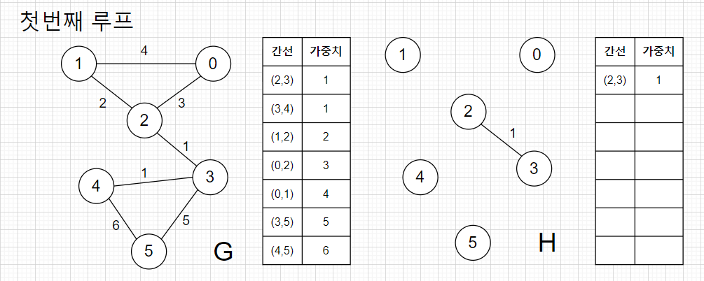 Step-1 : 정렬된 간선들중에서 가중치가 작은 (2,3)을 추출한다. (2,3)은 신장 트리 H에서 순환 구조를 만들지 않으므로 H에 추가해도 된다.