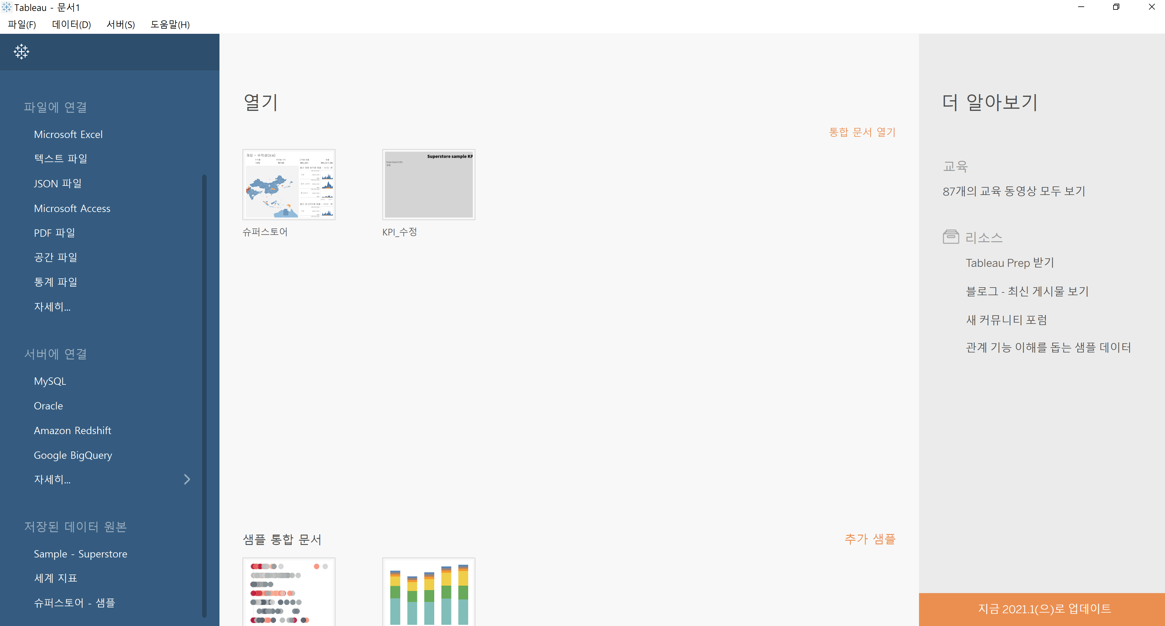 태블로를 클릭하여 들어간다면 위와 같은 화면이 표시된다. 왼쪽에 짙은 파란색으로 되어 있는 부분은 데이터를 불러오는 곳이고, 중앙에 있는 부분은 내가 지금까지 했던 대시보드와 작업 파일들이다. 그리고 오른쪽은 태블로에서 자체적으로 만든 교육자료와 리소스 자료들이 있다. 왼쪽 아래 -> 저장된 데이터 원본 -> Sample- superstore를 눌러 태블로에서 기본적으로 제공해주는 샘플 데이터를 열어보도록 하자.