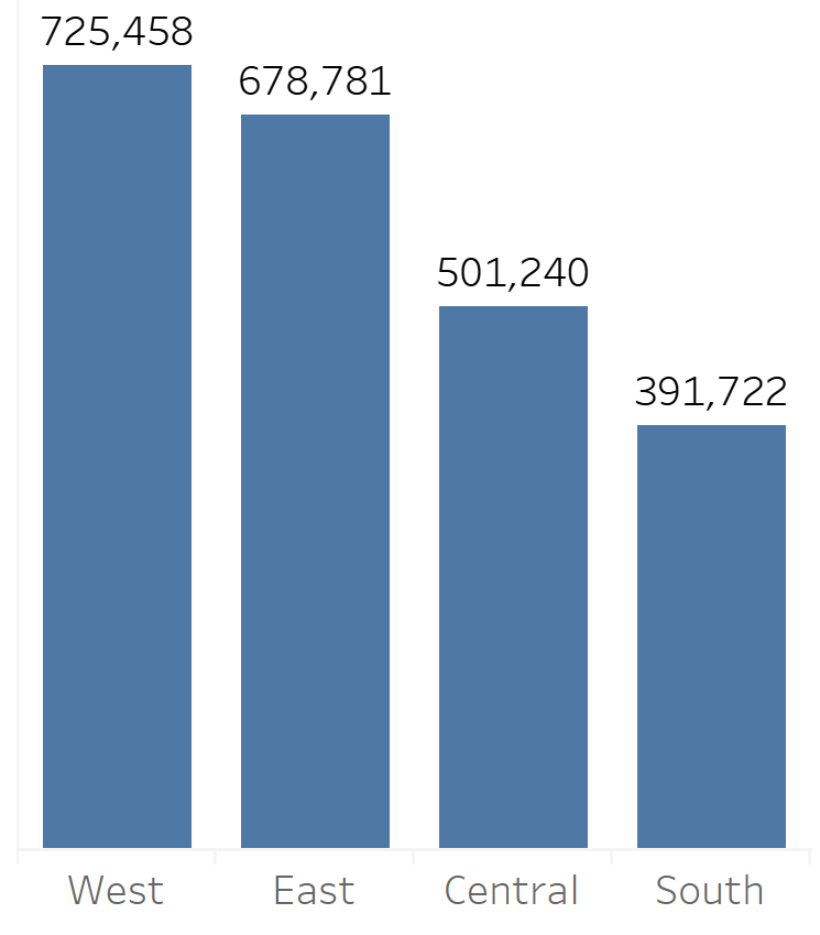 왼쪽 테이블의 orders를 열어보도록 하자. 왼쪽의 region, discount, sales와 같은 데이터들이 있는데 이 데이터의 파란색부분은 기본적으로 차원이라고 부르며, 기준이 되는 데이터라고 보면된다. 그리고 초록색으로 되어 있는 부분은 측정값이라고 말하며 해당 차트에서 나타낼 값이라고 보면 된다. 그리고 차트를 만드는 방법은 내가 원하는 값들을 상단에 행과 열 부분에 드래그 앤 드롭하거나 더블클릭하면 값이 자동으로 나온다. 사진의 차트는 Region별 Sales를 살펴본 것이다.