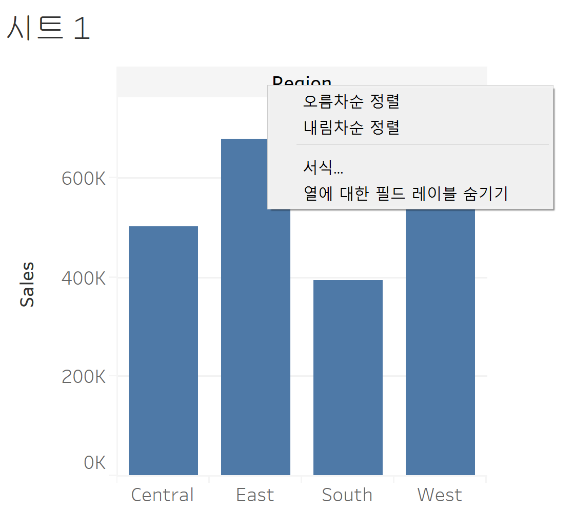 열 필드명이 차트의 이름으로 들어가 있는데 Region을 굳이 안 넣어도 Region인 걸 알아볼 수 있으니 숨기도록 한다.
