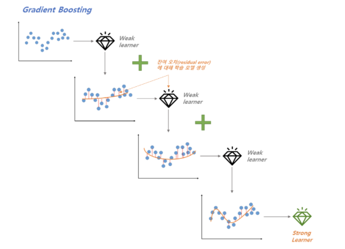 - GBM : 손실함수(검증 지표)의 Gradient로 오답에 가중치 부여