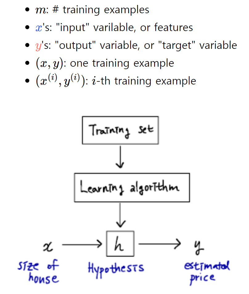 Hypothesis : input(feature)과 output(target)의 관계를 나타내는 함수. '진짜' 변수들의 관계식을 찾아내는 것은 불가능. 그러므로 집값을 결정하는 요인만 하더라도, 집의 평수 뿐만 아니라 방이 몇 개인지 역세권인지 영향을 주는 변수들이 매우 많아, "주로 이 변수들이 output에 영향을 미칠 거야"라고 추정하고, "~~~한 변수들과 output의 관계를 얼추 나타내보자"처럼 가설을 세우기 때문에 hypothesis라고 부르기 시작함.