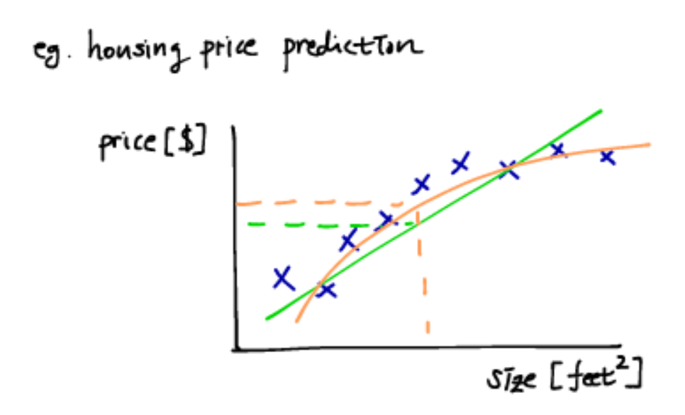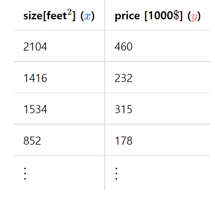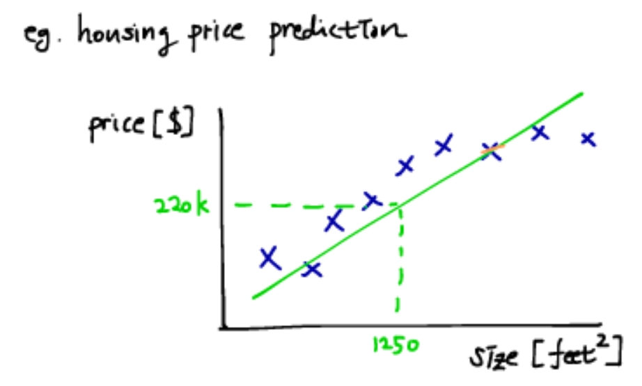 집값 예측의 예시에서, input은 집의 넓이 output으로 집값이다. 사전에 집의 넓이와 그 집의 가격을 조사해서 그 정보를 사용하므로 supervised learning이고 output에 해당하는 집값을 연속값을 가지므로 regression 문제