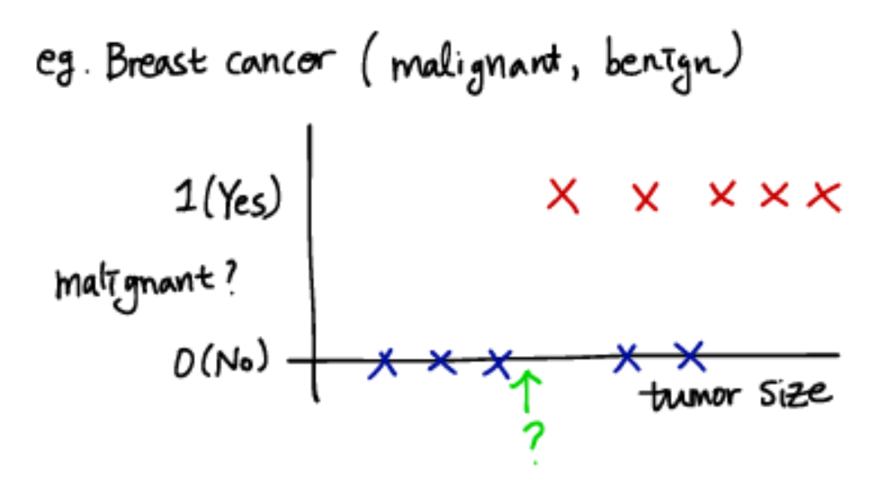 종양이 악성인지 양성인지 진단하는 문제. 사전에 종양의 크기와, 진단 결과(악성/양성)정보를 이용하므로 supervised learning. output에 해당하는 진단 결과가 악성/양성으로 discrete category이므로 classfication 문제.