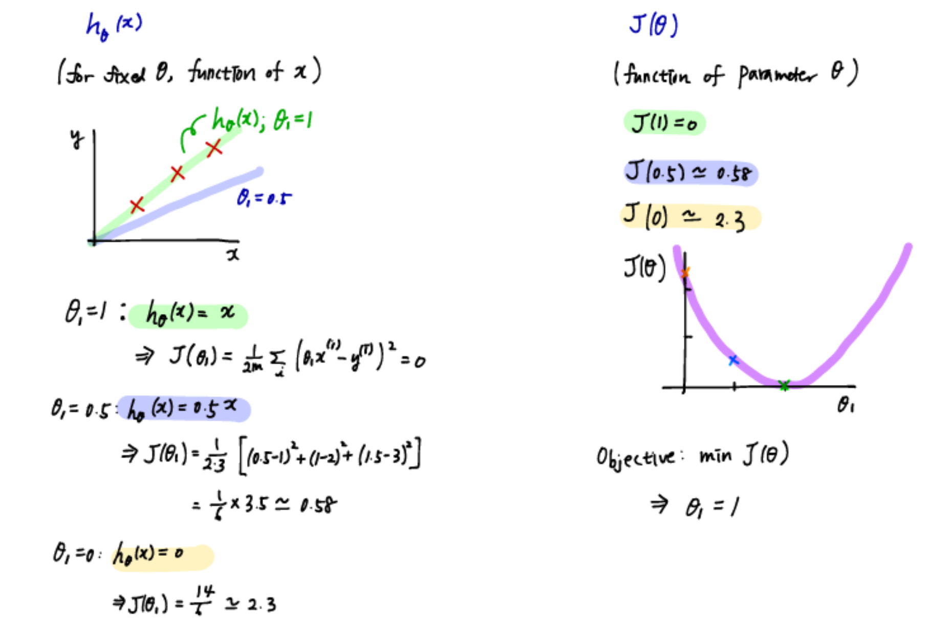 계산상의 편의를 위해 세타0을 0으로 주면 y절면이 0인 직선이 그어질 것이고 세타1에 따라서 기울기가 달라진다. input 데이터가 (1,1),(2,2),(3,3)이 있다고 했을 때 J(세타1)는 0이 되고, 오른쪽 그래프에 (1,0)이라는 점을 찍는다. 세타1인 경우 0.58이므로 (0.5, 0.58)의 점을 찍는다. 이와 같이 여러 세타1에 대하여 그래프를 그려나가다보면 포물선 형태가 되며, 이 포물선의 최소값(0)을 갖도록 하는 parameter가 최적의 값이다.