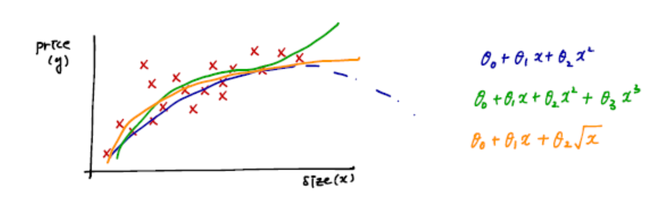 Hypothesis function이 반드시 linear가 되어야 하는 것은 아니다. 데이터에 잘 fit하는 형태로 나타내면 되고, 예를 들면 2ㅏ함수나 3차함수 곡선, 제곱근 함수 등의 형태를 이용할 수 있다.