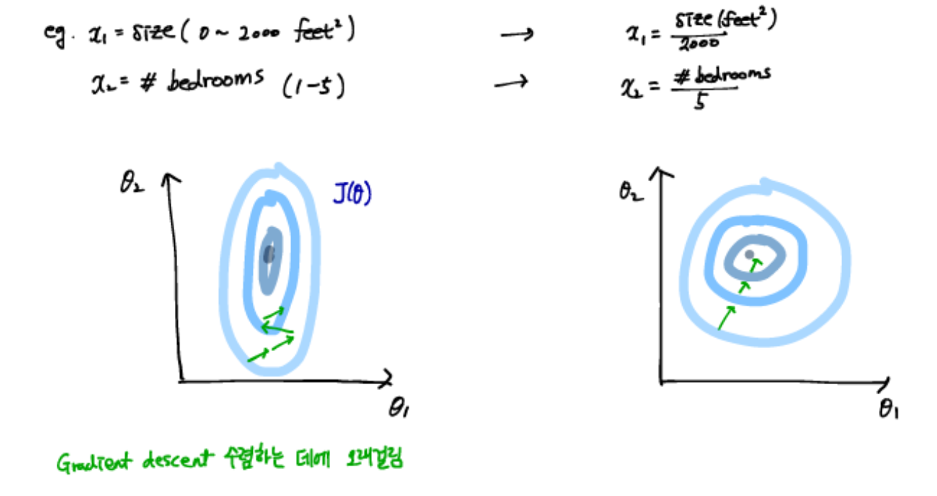 모든 feature가 비슷한 범위에 있으면 gradient descent가 더 빠르게 수렴하는 데 도움이 된다.