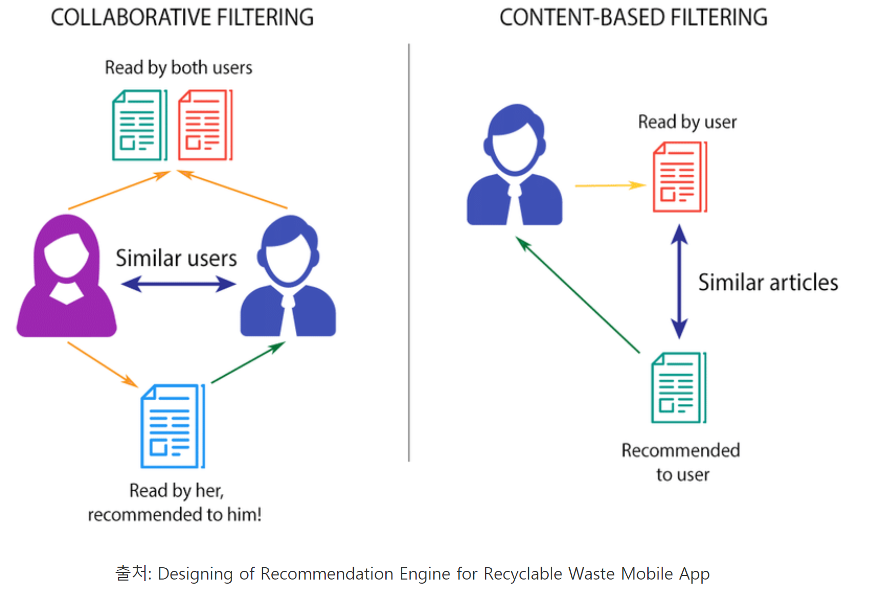 인터넷이 발전됨에 따라 아이템 구매 및 선호에 대한 사용자의 피드백을 얻기 쉬워졌다. 이런 피드백을 바탕으로 과거의 사용자-아이템 간 데이터를 활용해 취향을 고려한 아이템을 추천하는 것이 추천시스템의 기본적 아이디어이다. 추천 알고리즘은 대표적으로 아래와 같이 3가지가 있다.