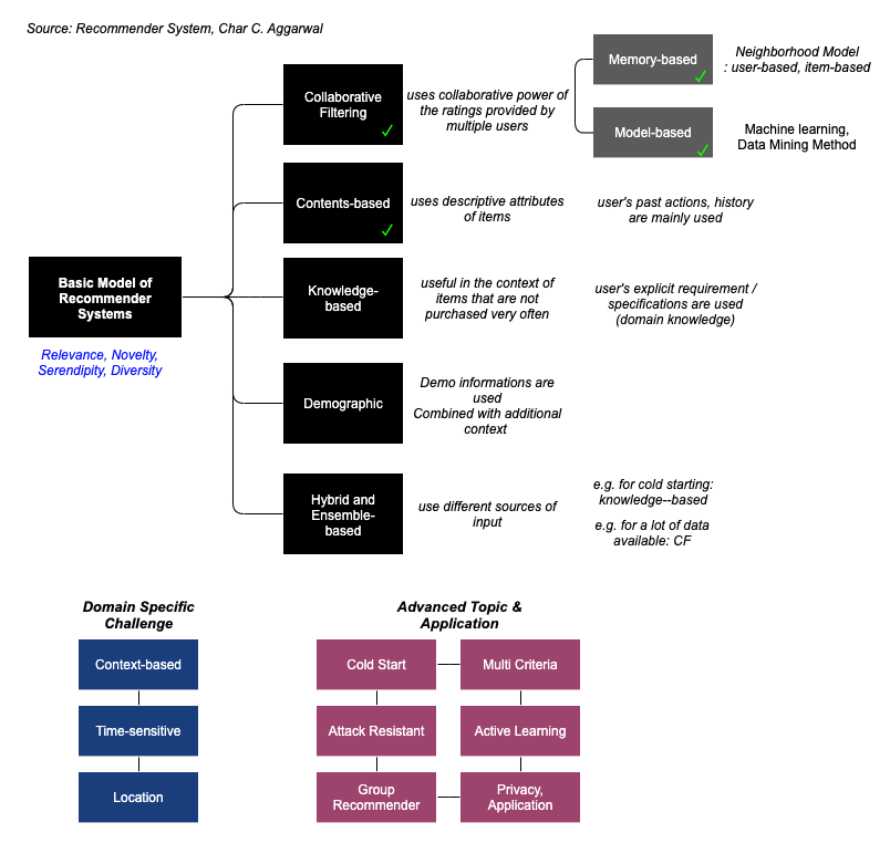 머신러닝에 KNN, SVM 등 여러 모델이 있듯이 추천시스템에도 여러 모델이 있다. 이 챕터에서는 이 모델에 대해 간단히 설명하고자 한다.