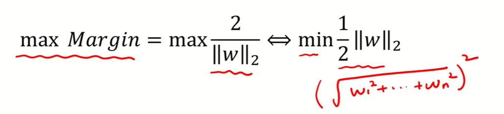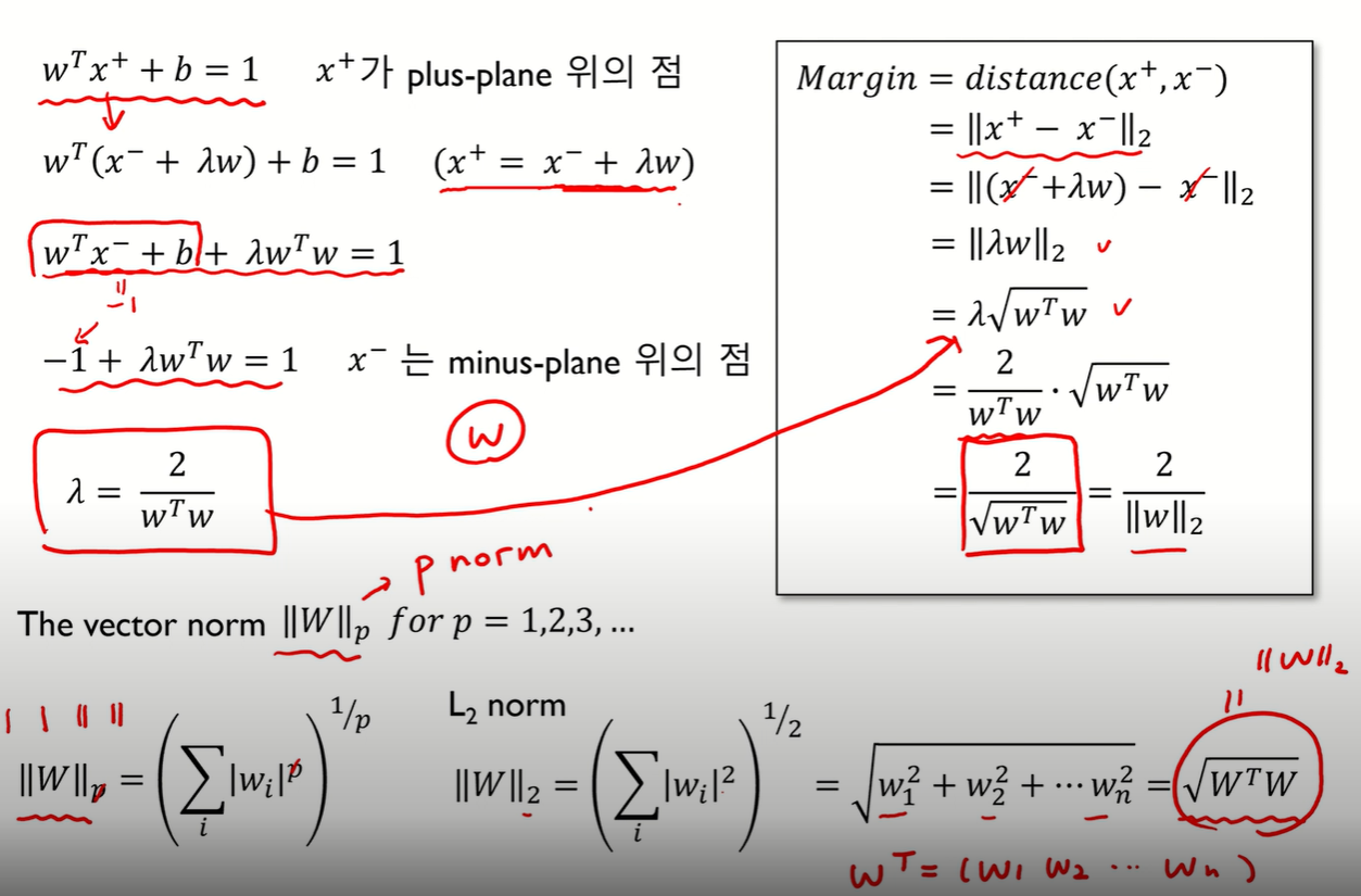 수식을 정리하면 람다 같은 2/w의 제곱이 되고 이 람다를 통해 최종적으로 Margin이 2/||w||2라는 것을 알 수 있다. ||w||2를 구하는 방법은 아래 L2 norm을 통해 구할 수 있다.