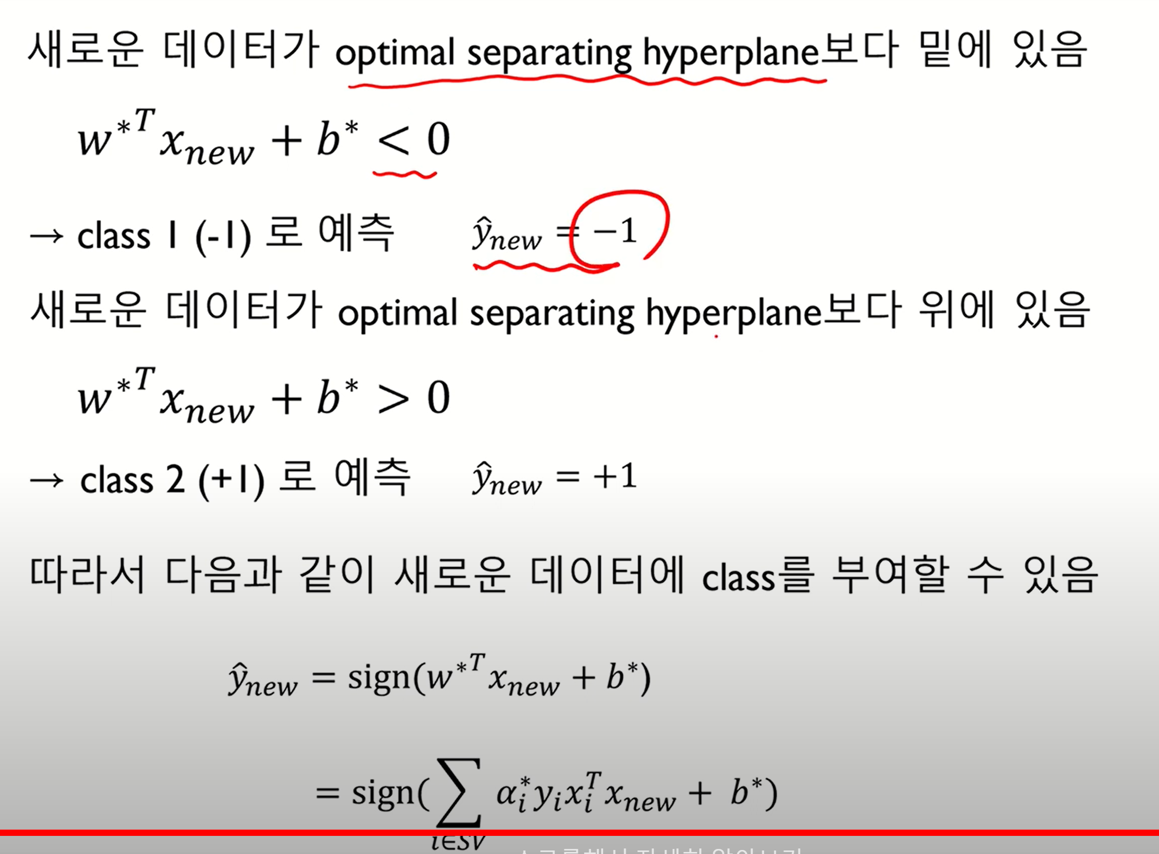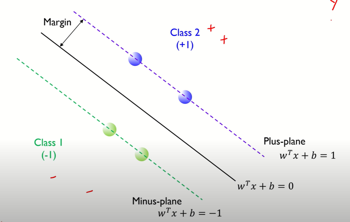 이 Margin을 최대화하는 hyper plane을 찾았으면 class는 hyperplane이 >=1일 때 class2(+1)이 되고 <=-1일 때 class 1이 되면서 최종적으로 분류가 된다.