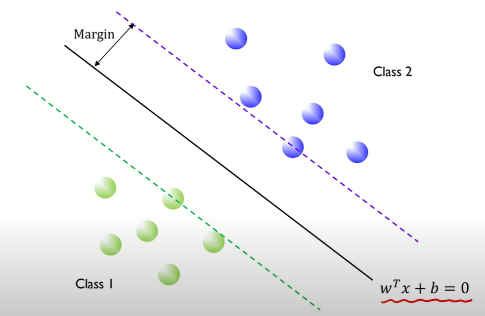 Margin은 각 클래스에서 가장 가까운 관측치 사이의 거리이다. 위 그림에서는 파란색 원이 hyperplane(wTx+b)와 가장 가까이 있고, 이 거리를 Margin이라고 부른다. 또한 Margin은 w(기울기)로 표현 가능하다.