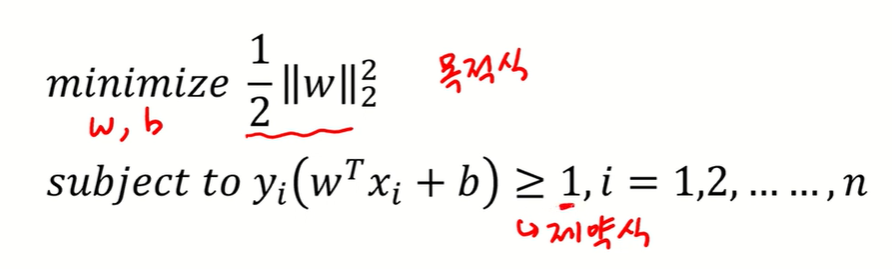 이렇게 최종으로 나온 수식을 바탕으로 margin을 최대화하는 w와 b를 찾는 것이다. 이는 다시 역수를 취해서 최소화하는 문제로 풀 수 있고 L2 norm으로 w 계산상의 편의를 위해, 제곱을 한다.