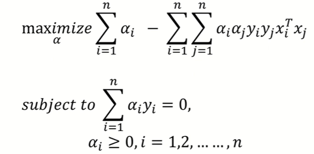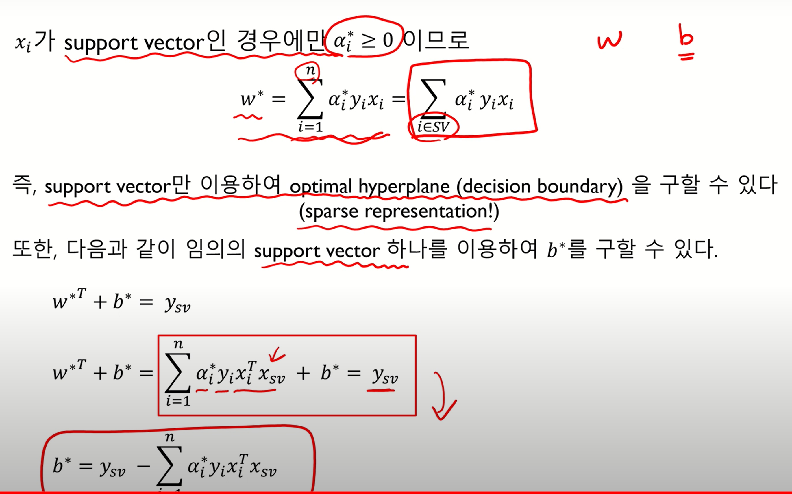 즉 정리하자면 xi가 support vector인 경우에만 ai>=0이므로 위 식이 성립한다. 위 support vector만을 이용하여 최적의 hyperplane(w와 b)을 구할 수 있다.