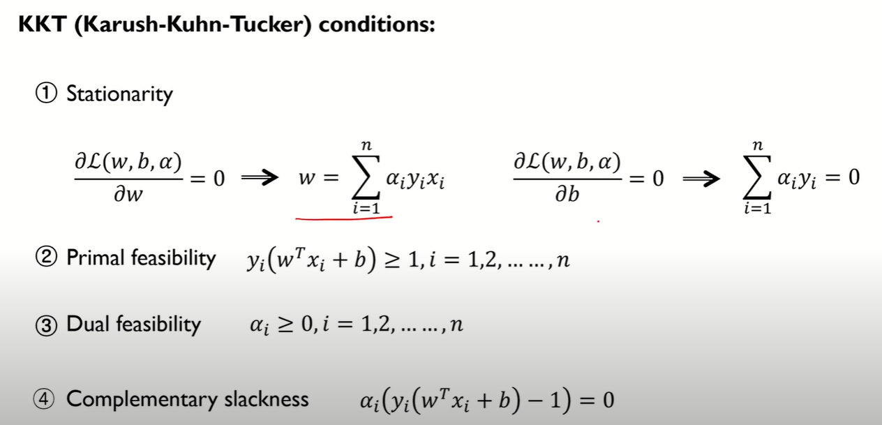 KKT 컨디션은 위에서 말한 (w,b,a)가 Lagrangian dual problem의 최적해가 되기 위한 조건을 뜻한다. 위 4가지 조건을 연산하여 w,b,a를 구할 수 있다.