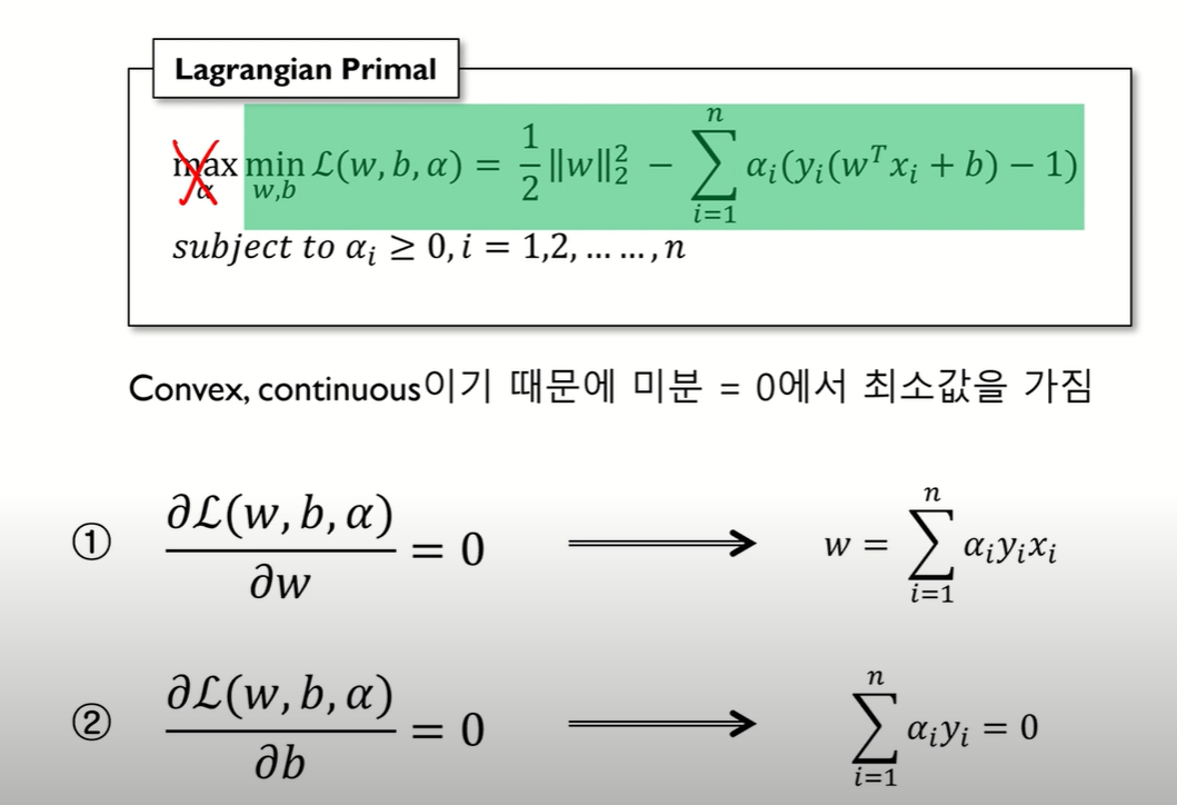 위 목적식과 제약식을 바탕으로 Lagrangian Primal을 구할 수 있고, 이 식을 각각 w와 b로 편미분해서 a값을 구할 수 있다. 이 a값을 구해야 나중에 w와 b를 구할 수 있다.