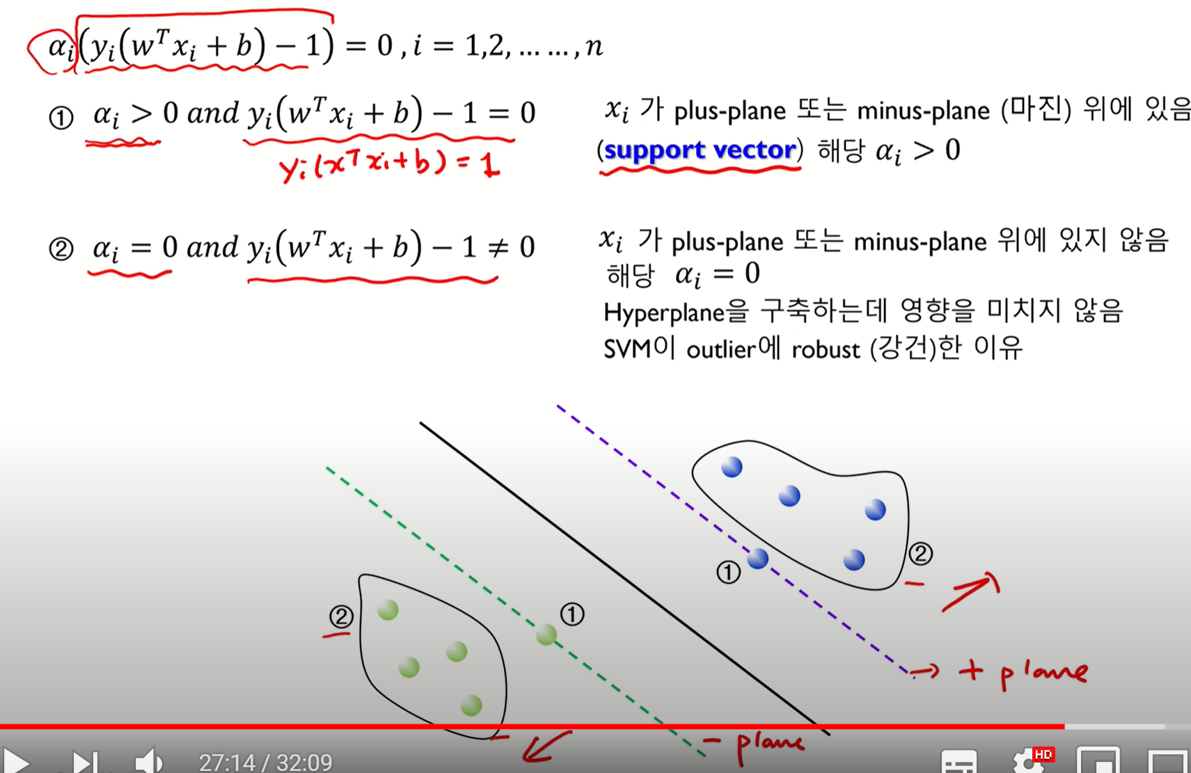solution을 구하는 방법을 기하학적으로 설명하면 위와 같다. ai가 >0일 때, =0일 때도 나눠서 풀 수 있는데 먼저 1번인 ai>0일 때는 yi(wTxi+b)=1이 되어 margin위에 존재한다. 즉 support vector를 말한다. 2번인 ai=0일 때는 yi(~~)!=0이기 때문에 마진 위에 있지 않고 경계 밖에 있는 것을 말한다.