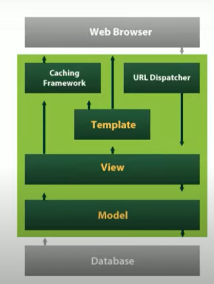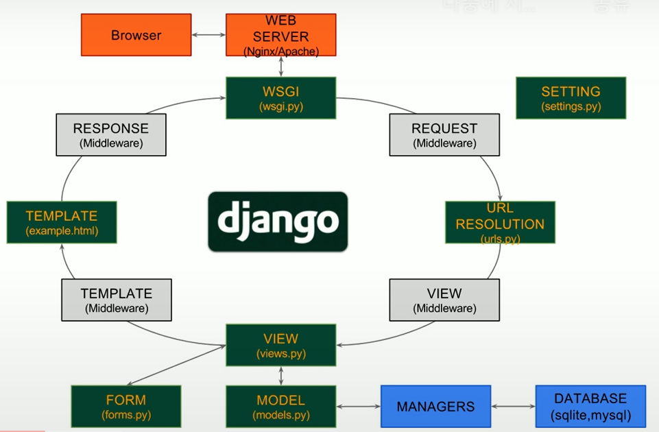 browser에서 webserver로 요청(신호가 들어옴) -> wsgi는 웹서버와 장고를 적절하게 결합(건들일 없음) -> urls.py이 정규표현식으로 되어 있는데, wsgi로부터 받아 view로 전송 -> views.py가 실질적으로 많이 작성하는 곳(데이터베이스를 가져오고 model에 신호를 보내는 등 여러 처리) + model.py에서 변수만 지정하면 따로 sql 쿼리 작성할 필요없이 managers가 다 알아서 해줌. -> view에서 가공한 데이터를 template(html파일에서 로직을 삽입)을 만들어서 다시 웹서버로 전송