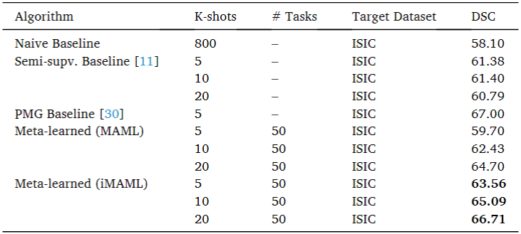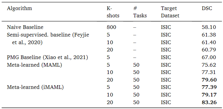 2가지의 다른 카테고리를 지닌 데이터 셋으로 meta-train을 진행한 것이다. 즉, 용종과 피부 데이터 set을 혼합하지 않고 구분된 상태로 train을 진행하였다는 의미다. train에 사용된 데이터는 Kvasir-SEG(polyp)와 PH2(skin)이고, test에 사용된 데이터는 ISIC-2018(skin)이다.
