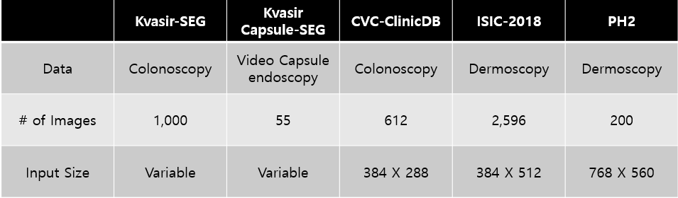 본 논문에서 사용한 Dataset은 내시경 용종 데이터(3 sets)와 피부 병변 데이터(2 sets)로 총 5가지의 데이터 셋을 사용하였다.